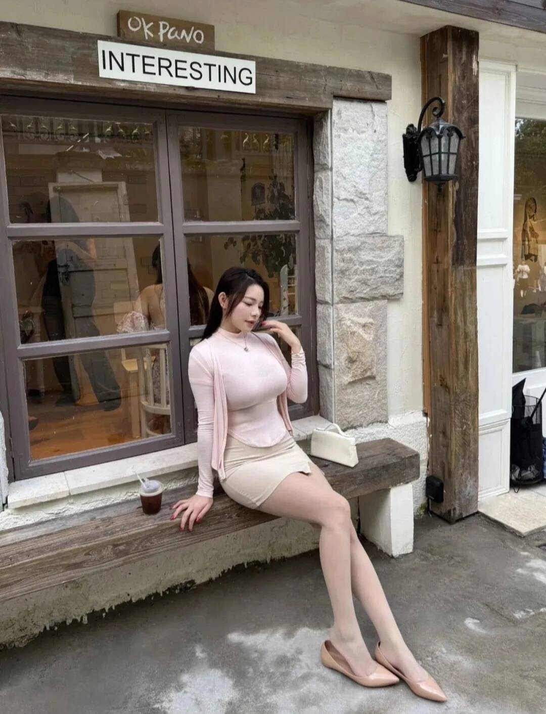 她站在一家叫“OK PANO”的咖啡馆外面。咖啡馆的外墙是浅色的,在阳光的抚摸下,散发着温暖的光芒,让人看了就觉得很舒服、很惬意。窗户上面有个木制的招牌,上面写着“OK PANO INTERESTING”,好像在跟路过的人讲着咖啡馆里有趣的故事。招牌上的木纹清晰可见,带着一种自然的质朴感,就像岁月在悄悄诉说着什么。咖啡馆门旁边还有一盏复古风格的街灯,造型特别独特,灯罩上的纹理细腻又精致,就像岁月留下的脚印。灯光透过灯罩洒下来,形成一片片柔和的光晕,把整个场景都变得浪漫又温馨。她就静静地站在那里,自然又放松,就像一幅美丽的画。这画面,就像一首动听的旋律,在我心里轻轻奏响;又像一首绚丽的诗篇,诉说着动人的故事。生活里这样的美好瞬间虽然短暂,但却能让我们在忙碌的日子里,感受到温暖和快乐。真希望以后还能遇到更多这样美好的画面,让生活变得更加精彩!